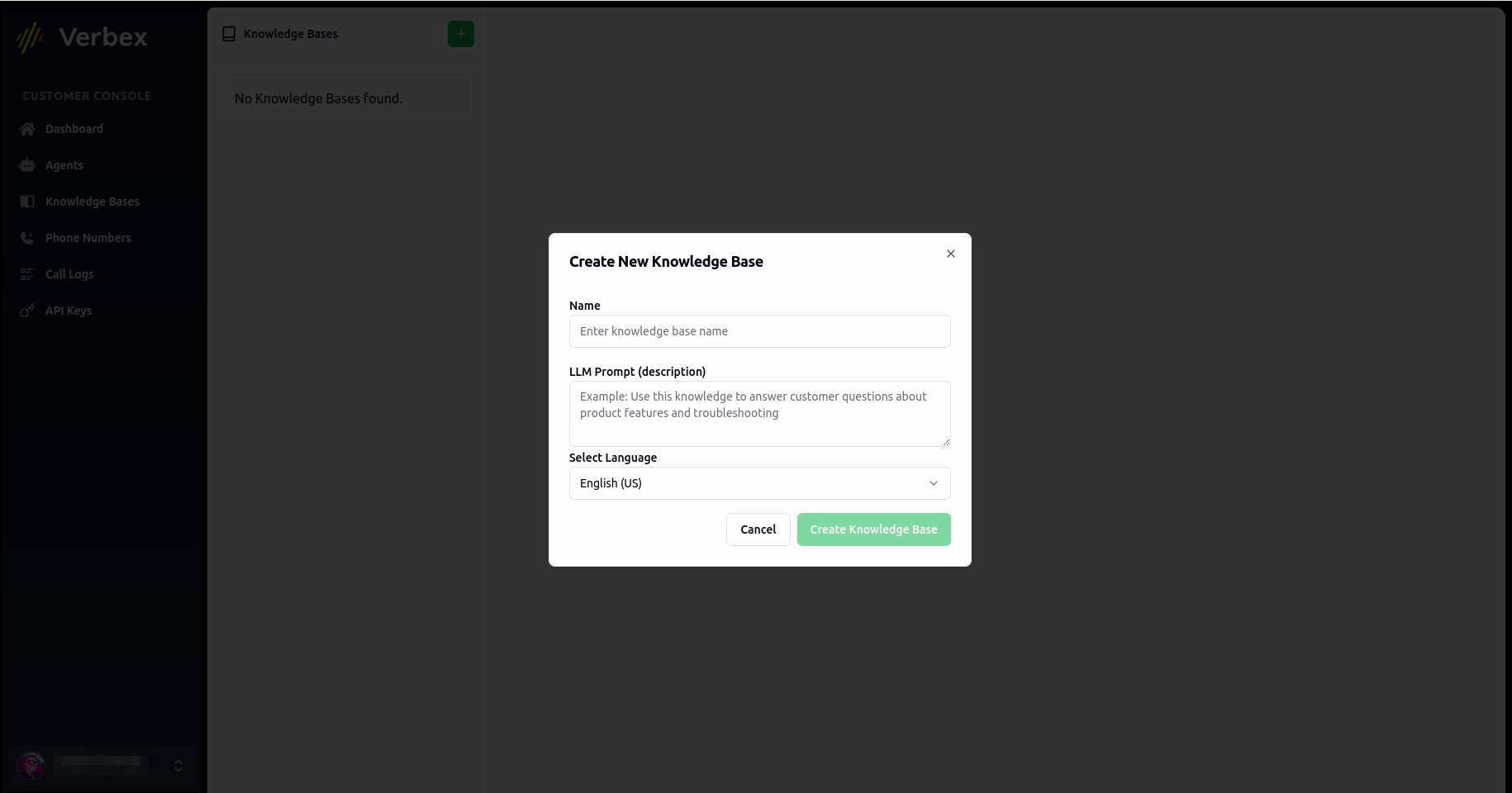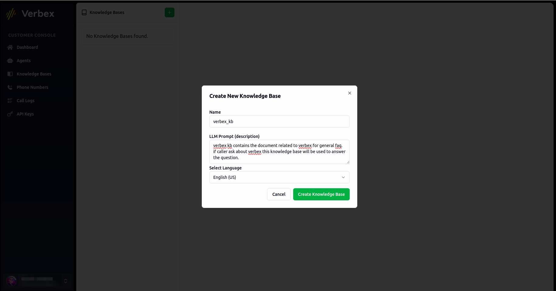 A Knowledge Base in Verbex is a centralized repository of information that your AI Agent can access to provide accurate, consistent responses to user queries. This feature enhances your Agent’s ability to handle common questions and provide reliable information.Types of Knowledge Bases