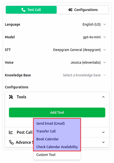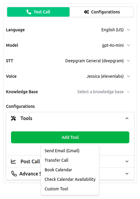 Pre-configured tools ready for immediate use:- End Call: Terminates conversation when complete